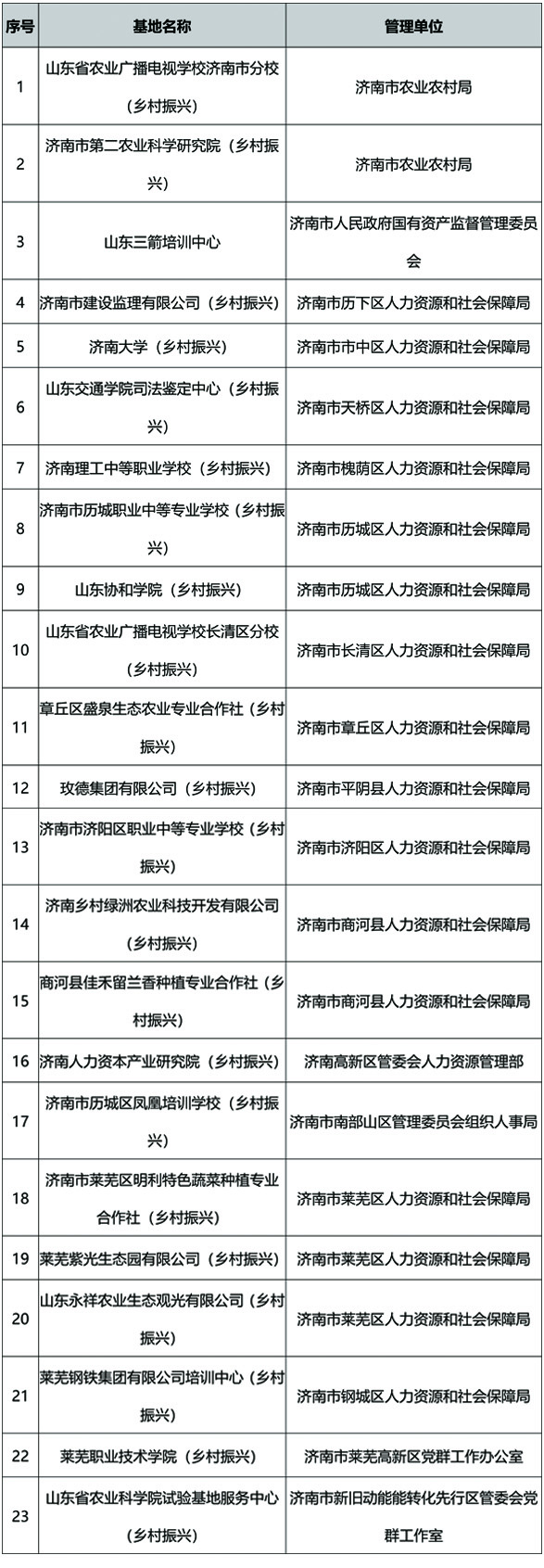 为深入实施专业技术人才知识更新工程,加快培养新旧动能转换、乡村振兴及经济社会发展重点领域高层次、急需紧缺和骨干专业技术人才,根据《关于印发山东省专业技术人员继续教育基地管理办法的通知》(鲁人社发〔2016〕38号)、《济南市专业技术人员继续教育规定》(济政办发〔2017〕42号)等文件规定,经专家评审考察,市人力资源社会保障局研究决定,在山东省农业广播电视学校济南市分校等23家单位设立市级专业技术人员继续教育基地(名单附后)。现将有关事项通知如下: